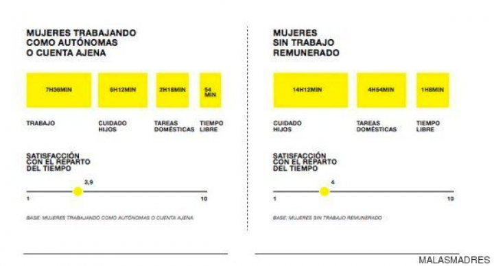 El sondeo trata de derrumbar el "sentimiento de culpa" de las madres que no llegan a todo y de "visibilizar" su doble jornada laboral. Una mujer madre dedica 16 horas y 6 minutos al día a sus dos empleos, dentro y fuera de casa. 7,36 horas van al trabajo externo, 6,12 a los hijos y 2,18 al hogar. Dispone apenas de 54 minutos al día de tiempo libre.