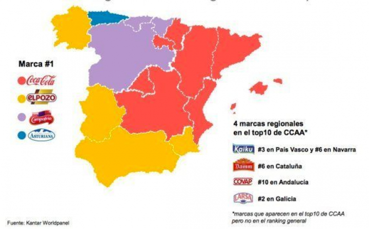 Pero el documento también detalla cuáles son las compañías que más venden en cada Comunidad Autónoma. "España es un país donde las regiones tienen un peso y diferencias en cuanto a los hábitos de consumo con respecto a la media nacional", subrayó el director general de Iberia de Kantar Worldpanel, Jorge Folch.