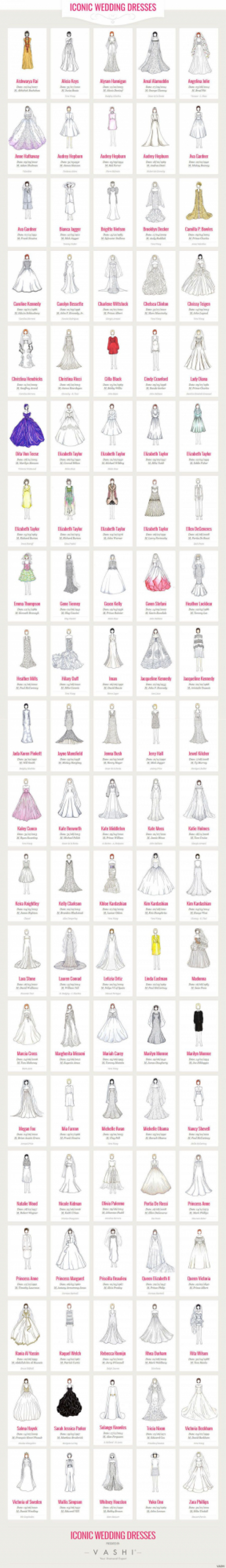 La web de los expertos en diamantes Vashi ha hecho una recopilación en esta infografía ilustrada de 100 de los vestidos de boda más icónicos de todos los tiempos. Desde los de miembros de la realeza como la reina Victoria, Kate Middleton, Diana de Gales, Rania de Jordania o la reina Letizia hasta los de Audrey Hepburn, Elizabeth Taylor (que ocupa ¡dos líneas! en la infografía), Angelina Jolie , Marilyn Monroe, Kim Kardashian o Yoko Ono.