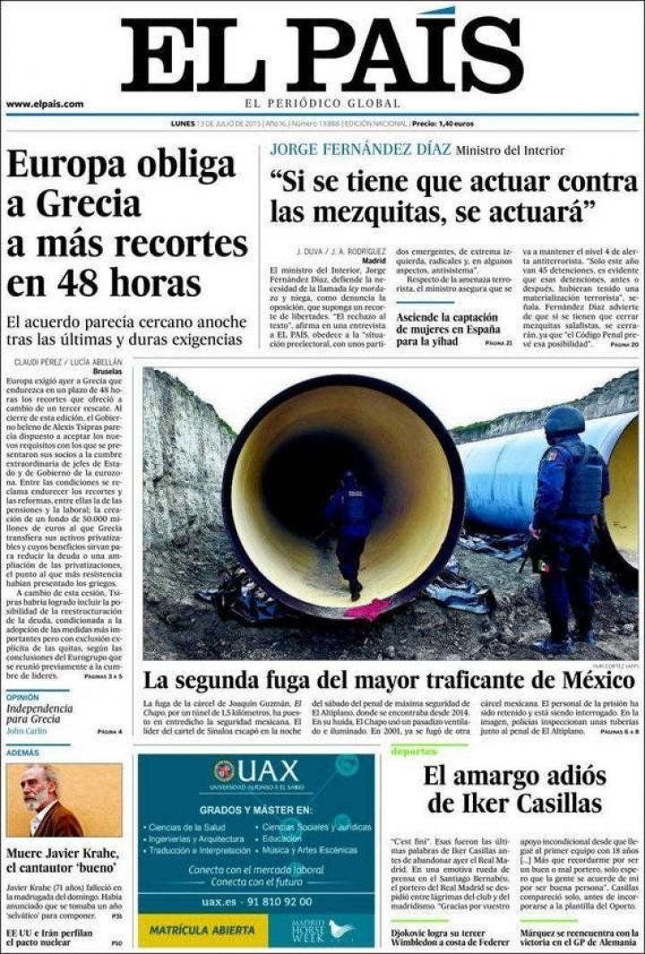 Un túnel prefabricado que aparece custodiado por policías mexicanos en la primera de El País y que ha servido para "la segunda fuga del mayor traficante de México". "El último narco", como llamó a Joaquín "El Chapo" Guzmán el periodista Malcom Beith, recuerda Luis Prados en un análisis de la fuga que supone "un durísimo golpe para la imagen del presidente Enrique Peña Nieto, de viaje en Francia, cuya popularidad ya estaba a la baja tras la tragedia de Iguala".