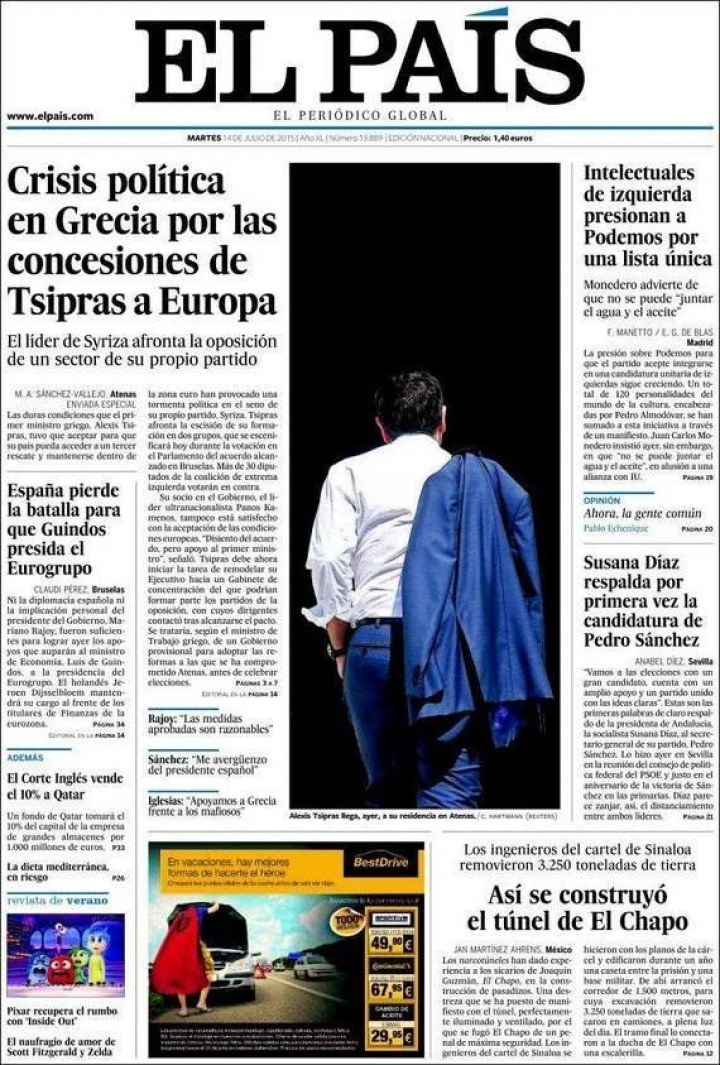 "Ganar un referéndum y perder la negociación entera no es un buen negocio político para quien lo hace. Su cabeza huele a pólvora. Requerirá un nuevo Gobierno más amplio, posiblemente de salvación y emergencia nacional, y elecciones lo más pronto posible; e incluso, ambas cosas". Así lo vaticina Lluis Bassets en su análisis para El País que completa Alicia Rivera al advertir que "si Tsipras fracasa en su intento de sacar adelante las reformas más urgentes, el Grexit volverá a estar encima de la mesa". De hecho, el alemán Bildt -el diario más leído de Europa o, al menos, ojeado- lo pide todavía porque considera que "Merkel ha salvado a Grecia con el dinero de los alemanes". La situación de la canciller no es tan complicada como la del primer ministro griego, pero el conservador Frankfurter Allgemaine asegura que las bases de la CDU están muy descontentas porque el 80% estima "que Grecia va a tirar todos los millones por la borda" o como reflexiona el jefe de economía de Die Welt: que Grecia deje de ser un pozo sin fondo.