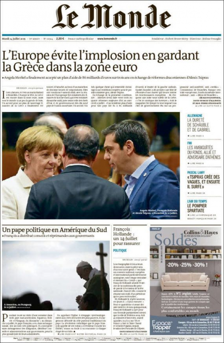 Las "casandras" abundan en la prensa anglosajona. Larry Elliot en The Guardian considera que "con Europa detrás Grecia se ve empujada a otros peligros: la recesión" y Neil Irwin, en The New York Times, estima que el acuerdo es un desastre para Grecia y quizá para Europa. En Francia, sin embargo, respiran aliviados el día de su Fiesta Nacional y Le Monde valora en su apertura que "Europa evita la implosión manteniendo a Grecia en el euro".