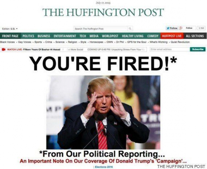 "Después de ver y escuchar a Donald Trump desde que anunció su candidatura a la presidencia (de EEUU), hemos decidido que no vamos a informar sobre la campaña de Trump como parte de la cobertura política del Huffington Post. En su lugar, vamos a cubrir su campaña como parte de nuestra sección de Entretenimiento. Nuestra razón es simple: la campaña de Trump es un espectáculo. No vamos a picar en anzuelo. Si estás interesado en lo que El Donald tiene que decir, lo encontrarás al lado de nuestras historias en los Kardashians y The Bachelorette".