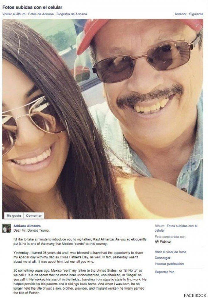 O esta joven, Adriana Almanza, que usa su cuenta de Facebook para presentarle a Trump a su padre, ejemplo de todo lo bueno que no quiere ver en la inmigración a EEUU:
