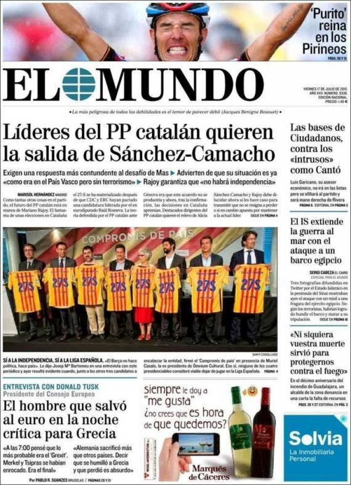 "El pacto Mas-Junqueras incluye medidas para burlar el Estado. El proceso de independencia contempla la ruptura con el Constitucional y la creación de una Hacienda propia para evitar sanciones y represalias". Así lo asegura El País en su apertura haciéndose eco, también, de lo dicho ayer por Rajoy: "no va a haber independencia". Es "Madrid ante al laberinto" titula su análisis Enric Jualiana en La Vanguardia en el que explica que "hace una semana, los centros de poder españoles confiaban en que Esquerra lograría estrangular a Artur Mas". "El gobierno y el Partido Popular se encuentran ahora ante un septiembre muy complicado". Hasta el punto que "líderes del PP catalán quieren la salida de Sánchez-Camacho y exigen una respuesta más contundente al desafío de Mas", asegura El Mundo. Estos populares catalanes estiman que su situación es ya "como era en el País Vasco pero sin terrorismo".