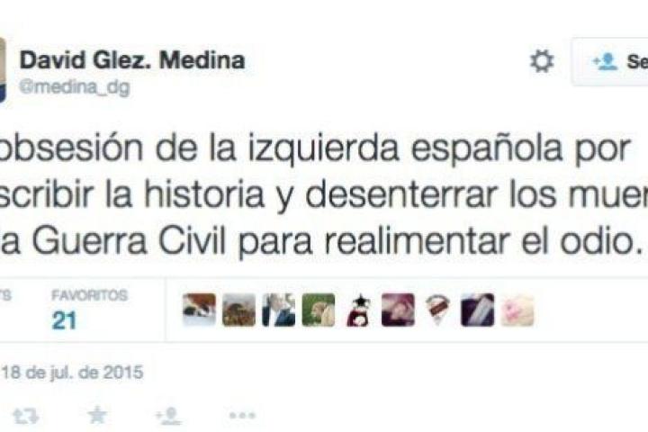 David González Medina ha causado polémica en Twitter. Hablando de memoria histórica. Y un 18 de julio, día del alzamiento nacional. Medina, que fue portavoz de campaña Partido Popular de Asturias, integró las listas en las elecciones autonómicas y también fue presidente fugaz del PP en Gijón, se ha tenido que explicar tras lanzar este mensaje en su cuenta personal: