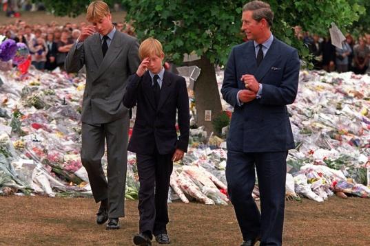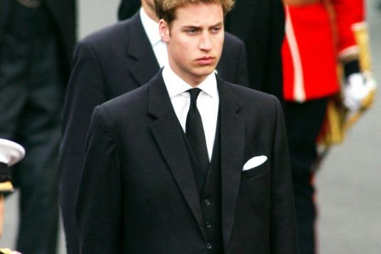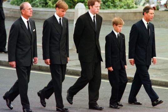Con el Duque de Edimburgo, su tío Earl (hermano de Diana), su hermano y su padre, en el funeral por Diana. Tanto él como su hermano afrontaron ante las cámaras el funeral con mucha madurez.