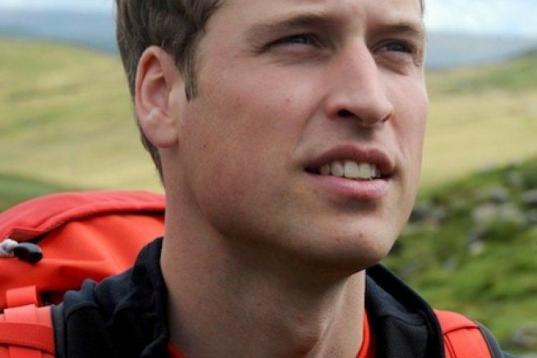 Descripción: Britain's Prince William greets a dog trained for rescue work during a fell walk in Cumbria's Lake district, England accompanied by a group...
