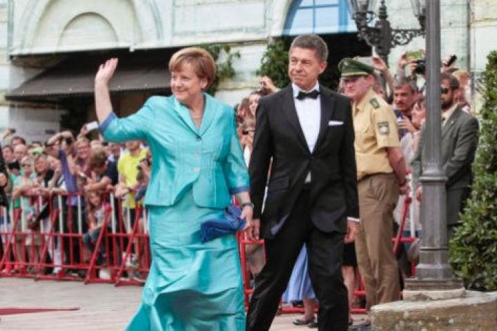 Merkel, fanática de Wagner, acudió como es su costumbre al evento acompañada de su marido, luciendo un traje azul turquesa y saludando de visible buen humor a los centenares de curiosos que aguardaban a la entrada y que la recibieron con aplausos.