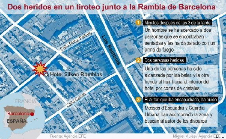 La agencia EFE afirma que el autor de los tiros, que según algunos testigos iba encapuchado, ha sido un hombre que se ha acercado a dos personas que se encontraban sentadas en el exterior del hotel Silken, en las inmediaciones de la calle Pintor Fortuny, y les ha disparado con un arma de fuego.