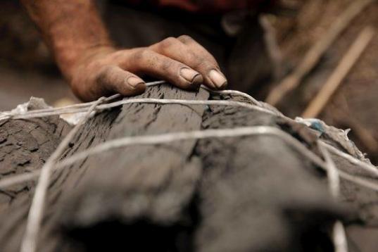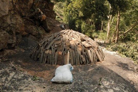 Ahmad trabaja en unos terrenos de propiedad privada que son parte de la reserva natural. El propietario le permite trabajar allí a cambio de una parte de sus beneficios de la venta de carbón vegetal. Después de cortar la madera y dejar que seque, Ahmad necesita dos días para apilar la madera en una estructura redonda con un agujero en el centro. El proceso de combustión lenta que crea carbón tarda unos días más.