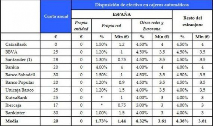 - Caixabank: La entidad fue pionera y desde marzo cobra dos euros a todo el que no tiene cuenta allí y utiliza sus cajeros para sacar dinero, independientemente de si pertenecen a la misma red de medios de pago (ServiRed) y de la cantidad a retirar. La compañía explicó que su intención era y fidelizar clientes, aportándoles un "valor diferencial" respecto a la competencia.