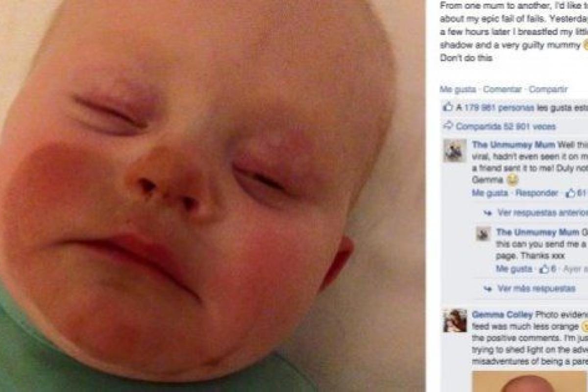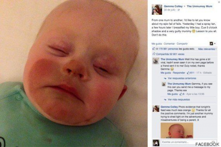 Gemma Colley se ha convertido en un fenómeno viral. Aunque ella, claro, no quería. Pero es que su fail es total. La joven británica, mamá primeriza, quiso lucir arreglada pese a su reciente parto y, para mantener su buen tono, decidió aplicarse un autobronceador en spray. Hasta ahí, todo bien. Pero... luego se puso a darle de mamar a su hijo, con lo cual pasó lo esperado: que el niño acabó con todo el potingue de mamá en sus morritos.