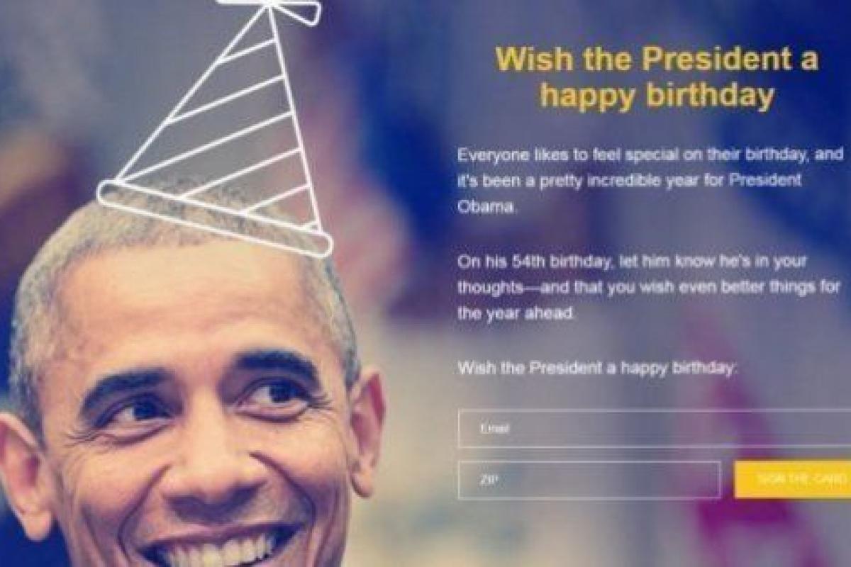 "A todos les gusta sentirse especiales en su cumpleaños, y éste ha sido un año bastante increíble para el presidente Obama", dice el mensaje que da la bienvenida en la página. "En su cumpleaños 54, háganle saber que está en sus pensamientos y que le desean cosas aún mejores para el año que tiene por delante", proponen.
