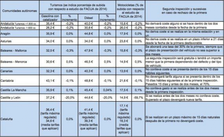 Según Facua, la tarifa media regulada de a ITV de los turismos diésel y catalizados es de 38,81 euros, un 1,3% por debajo de 2014. Por comunidades, Madrid (53,30 euros) tiene las tarifas más elevadas para turismos diésel, seguida de Valencia (51,64 euros) y Cantabria (48,80 euros).