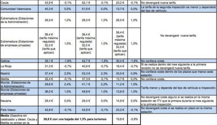 Las mayores variaciones en las tarifas de la ITV para 2015 se han producido en Castilla y León, con una reducción del 20 por ciento para los turismos de gasolina y diésel, seguida de Galicia (-1,6%), La Rioja (-0,7%), Mallorca (-0,3%), Andalucía (-0,2%), Cantabria y País Vasco (-0,1%, respectivamente).