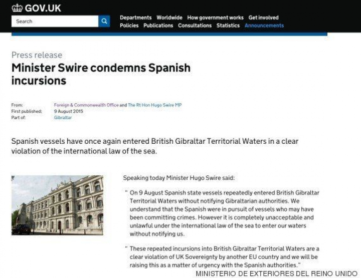 "Estas repetidas incursiones en aguas territoriales de Gibraltar suponen una clara violación de la soberanía de la Unión Europea y presentaremos con urgencia este caso a las autoridades españolas", ha hecho saber el ministro de Estado para la Foreign Office, Hugo Swire.