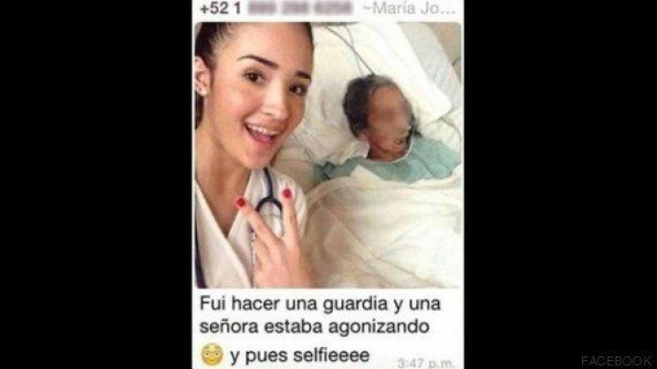 El selfie fue compartido profusamente a través de WhatsApp junto con el texto: "Fui hacer una guardia y una señora estaba agonizando, y pues selfieeee". No fue la joven la que escribió ese mensaje.