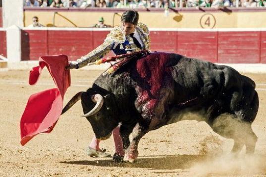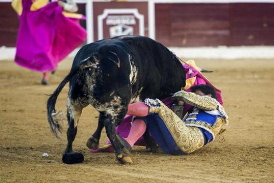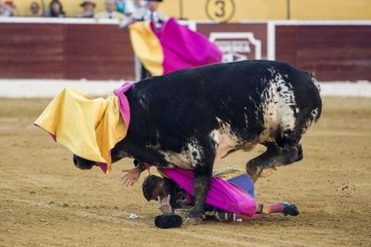 Francisco Rivera fue cogido mientras saludaba con el capote al segundo toro de su lote, de nombre Traidor, de la ganadería de Albarreal, que le prendió por la zona abdominal, dejándolo varios segundos colgado del pitón.