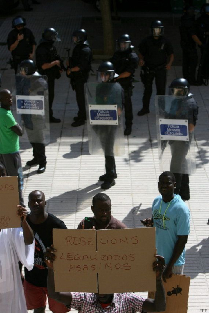 Tras conocer el suceso, unos 200 compatriotas del fallecido, la mayoría de ellos dedicados a la venta ambulante y el top manta, se han concentrado en la plaza, donde se han enfrentado con los antidisturbios montando barricadas y arrojándoles piedras, palos, bolsas de basura y contenedores, así como sillas y mesas de las terrazas.