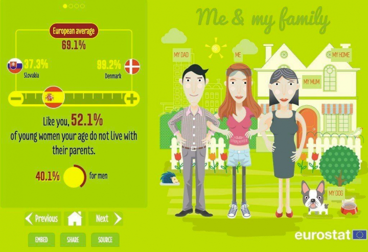 De la web se extraen comparativas que reflejan diferencias también entre sexos. Por ejemplo, siguiendo con la independización, la mayoría de las mujeres españolas se va de casa a los 28 años (27,9) mientras que los hombres tardan más, lo hacen rozando los 30 (29,8). Según el último estudio del Observatorio de la Emancipación del CJE (datos de 2014), únicamente dos de cada diez jóvenes en España pueden emanciparse antes de los 30 años y alrededor de 200.000 han emigrado fuera del país desde que comenzó la crisis, hasta finales del año pasado.