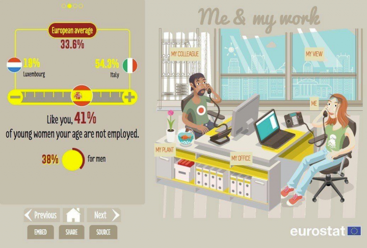 Por otro lado, la vida personal, el trabajo, el uso de internet, o cómo emplean los jóvenes su tiempo libre son otros de los aspectos que se pueden comparar en esta web. Así, en el caso de la situación laborar juvenil, en España el 41% de las mujeres de 29 años no tienen trabajo. Un 38% en el caso de los jóvenes, mientras que la media europea está en el 33,6%.