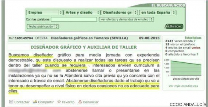 "Buscamos diseñador gráfico para media jornada [...] abstenerse diseñadoras dado que el trabajo que va a tener que desempeñar a nivel físico, en ciertas ocasiones, no es adecuado para ellas”.