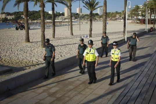 La agente Martina Anderson y el sargento Brett Williams, de la Policía británica, recorren estos días uniformados y con casco y gorro la playa y las calles de Magaluf, área de Mallorca que en verano recibe hordas de turistas atraídos por el alcohol a granel, el sexo y el sol.