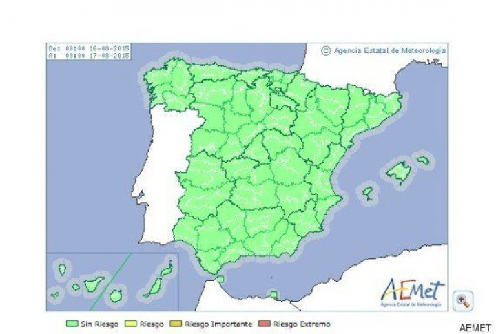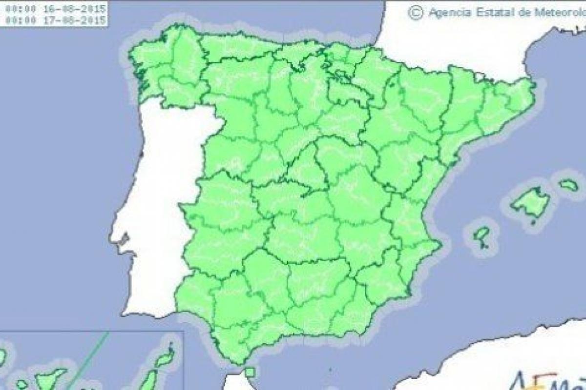 Tras las semanas que llevamos de calor extremo y lluvia dañina, lo que se espera este domingo roza la gloria. La Agencia Estatal de Meteorología (Aemet) no ha emitido ningún aviso por riesgo de algún tipo de fenómeno meteorológico para 16 de agosto. Así que el mapa de España podrá verse de nuevo en color verde.