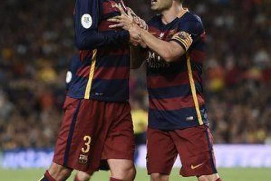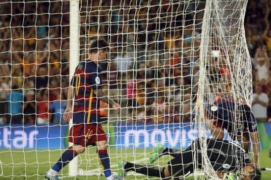 Cuando parecía que el partido se marchaba al descanso sin goles, una gran jugada de Mascherano, que arrancó desde la zaga, llegó a Rakitic. El croata centró a Luis Suárez, quien cedió con el pecho a Messi para que el argentino, con un control y un disparo, marcara el primero.