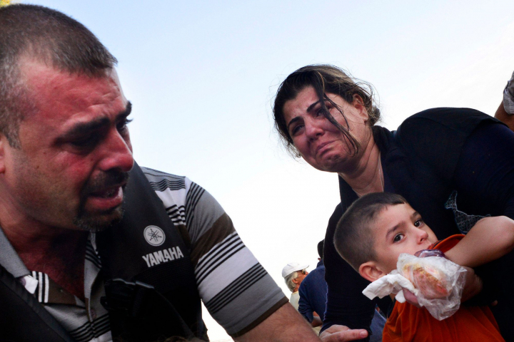 Una familia siria llora al llegar a Grecia.