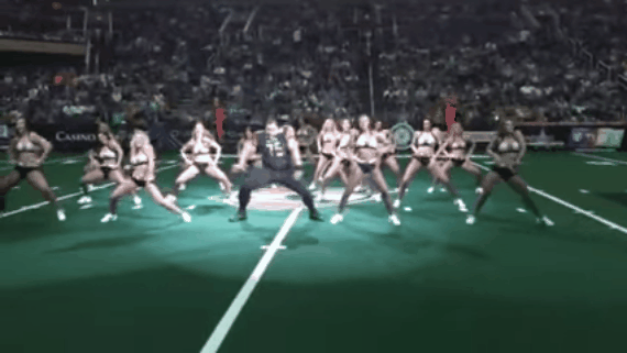 Ocurrió en un tiempo muerto del partido de fútbol americano de los Arizona Rattlers contra los Spokane Shock del pasado sábado. Las animadoras de los Rattlers estaban ejecutando su coreografía cuando de repente, un hombre ataviado como un jugador se unió a ellas.