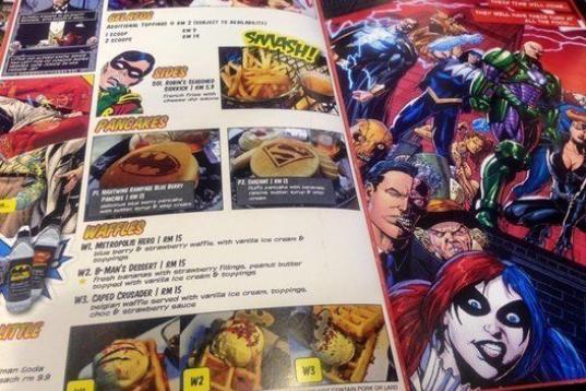 Toda la comida de este restaurante hace referencia a los personajes de la firma, desde las bat-pizzas a los rollitos de pavo de Wonder Woman, pasando por el té Flecha Verde.