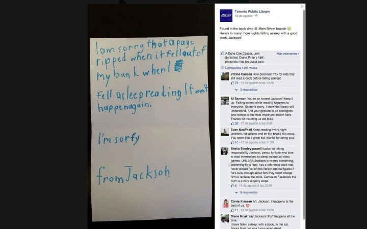 Ante tan adorable disculpa, la Biblioteca Pública de Toronto, publicó la nota en su página de Facebook y le añadió el siguiente mensaje: "Por muchas más noches en las que conciliar el sueño con un buen libro, Jackson". La publicación con la carta se ha compartido ya más de 1.000 veces en las redes sociales.