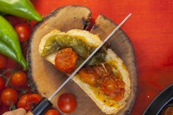 Los pimientos son verdes italianos y se sirven sobre una rebanada de pan de hogaza.