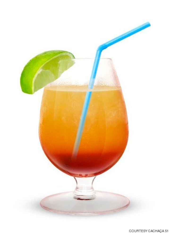 Vierta la granadina en el fondo de una copa y cúbrela con hielo. En una coctelera coloque la cachaza con los zumos de naranja y fruta de la pasión. Agita bien y vierte en la copa. Adorne el coctel con una rodaja de lima. Colocae una pajita azul formando un ángulo de 45 grados si deseas que se vea exactamente igual.