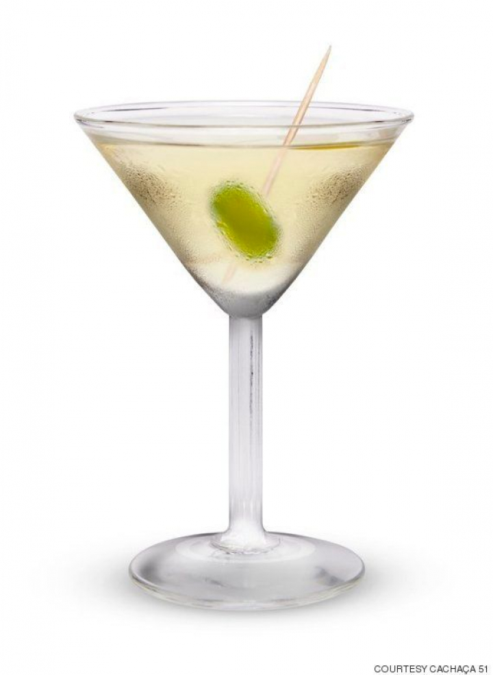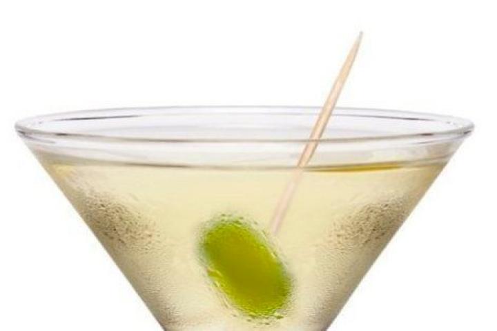 Mezcla los ingredientes en una vaso con hielo. Agita hasta que esté muy frío. Cuela en la copa el martini frío y coloca la aceituna atravesada con un paillo.