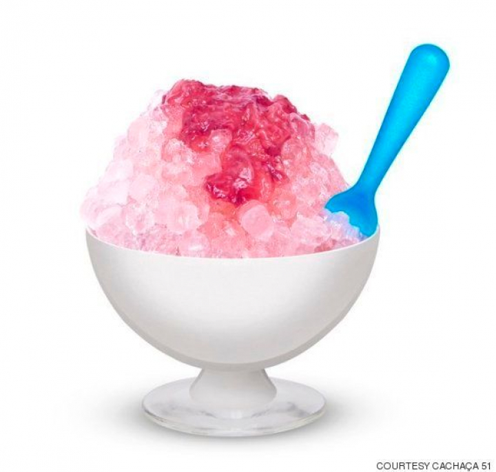 Mezcla la cachaza con la lima y el jarabe en una coctelera. Agítalo y viértelo en la copa. Añade hielo picado y Aperol en la parte superior para darle el color rosa. Coloca la cuchara en la misma posición que la del emoji para que sobresalga hacia el lado derecho.