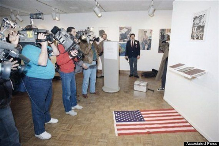 Scott, un estudiante del Instituto de Arte de Chicago, preparó un montaje en el que los visitantes no podían ver un libro de fotografía situado en el centro de la muestra si no era pisando la bandera estadounidense extendida sobre el suelo. Como resultado, algunos espectadores fueron arrestados por pisar la bandera, después de que un veterano de guerra alertara a las autoridades sobre el hecho. (El mismo Scott fue arrestado también por prender fuego al estandarte, y por desafiar la Ley de Protección de la Bandera en 1989).