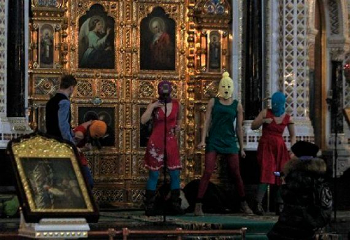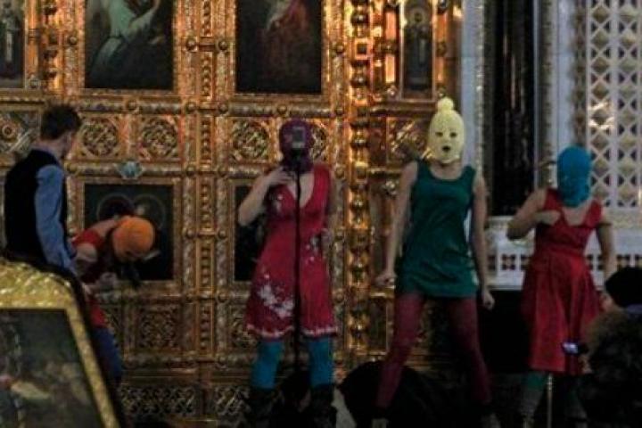 En febrero de 2012, cinco miembros del grupo punk rock feminista Pussy Riot montaron una representación en la Catedral del Cristo Salvador de Moscú para protestar contra el apoyo de la iglesia a Vladimir Putin durante sus elecciones. El colectivo, vestido con minifaldas y pasamontañas de colores chillones, bailó desenfrenado al grito de "¡Madre de Dios, Virgen Divina, echa a Putin!" Después de 40 segundos, la Policía las desalojó. A continuación, tres de las miembros del grupo fueron condenadas a prisión por "vandalismo motivado por odio religioso".