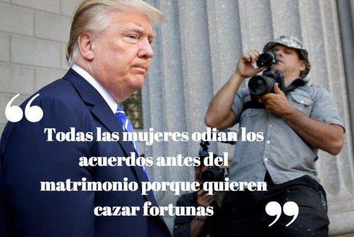 En su libro "El arte de volver", publicado en el año 1997, Trump escribió: "Desde el principio tienes que dejarle claro a las mujeres qué les va a quedar si las cosas salen mal. Hay 3 tipos de mujeres. La primera es la que si realmente ama a su marido, se niega a firmar el acuerdo por un tema de principios. La segunda es la que tiene todo calculado y quiere sacar provecho del idiota con el que está casada. La tercera es la que lo acepta porque prefiere dar un golpe rápido y quedarse con lo que le ofrecen".