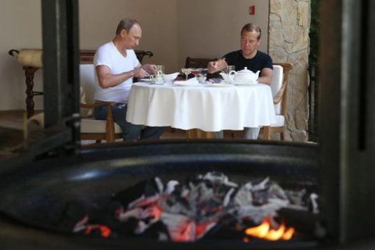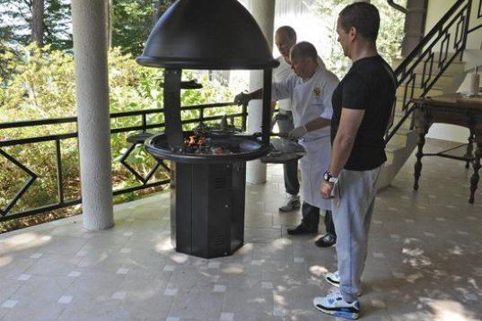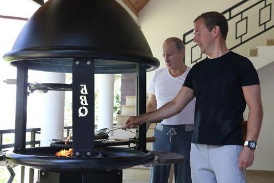En Bocharov Ruchei, la residencia del presidente ruso ubicada en el mar Negro cerca de la ciudad de Sochi, los dos políticos aparecen en otra imágenes viendo la televisión tras el entrenamiento, asando carne en una barbacoa o tomando té.