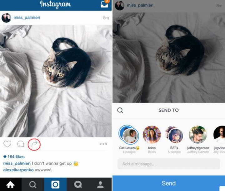 Desde este martes Instagram permite enviar fotos y vídeos directamente desde la pantalla principal. A través de un icono nuevo con forma de flecha debajo de la imagen (junto al icono del corazón y el de comentar), el usuario podrá enviar ese contenido como un mensaje directo a otra persona o a un grupo.