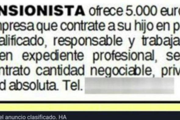 Un pensionista pone un anuncio ofreciendo dinero a quien contrate a su hijo