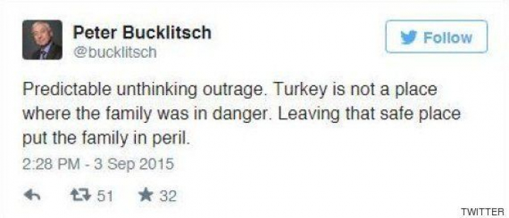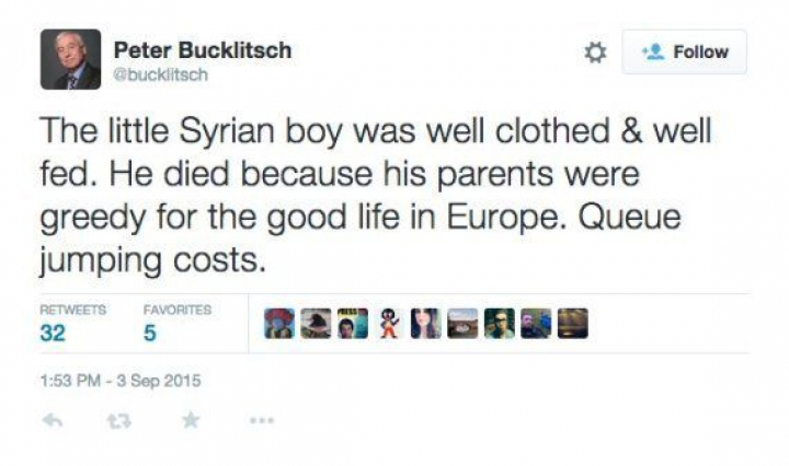 "El niño sirio estaba bien vestido; bien alimentado. Murió porque sus padres fueron codiciosos con la buena vida en Europa. Saltarse la cola tiene su coste". Este es el tuit que ha indignado a los usuarios de Twitter, publicado por el diputado del partido euroescéptico inglés UKIP, Peter Bucklitsch, este jueves. Se refiere a Aylan Kurdi, el niño ahogado cuya imagen se ha convertido en símbolo de la tragedia de los refugiados sirios. Posteriormente el tuit ha sido borrado y su cuenta de Twitter eliminada.