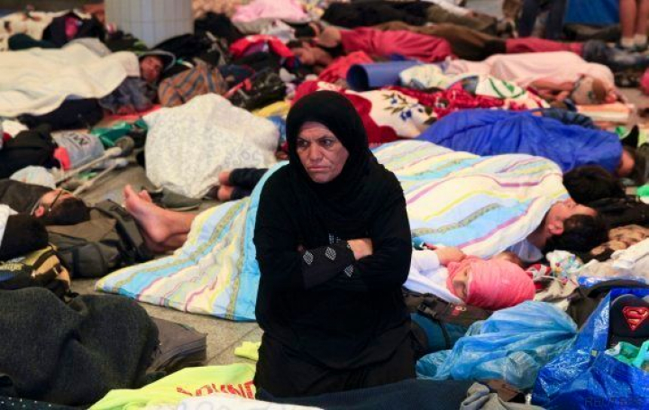 Una mujer siria hace noche a las puertas de la estación de Budapest.
