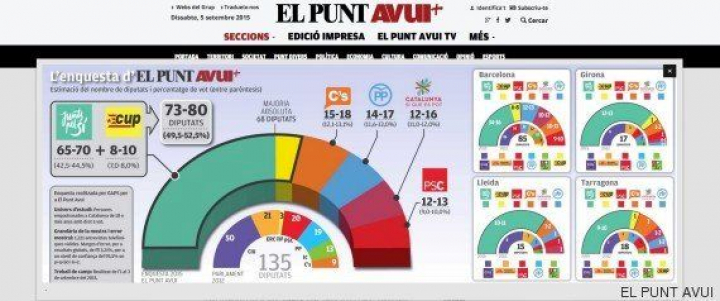 La candidatura soberanista podría lograr entre 65 y 70 diputados en las próximas elecciones del 27S, consiguiendo en solitario la mayoría absoluta, según un sondeo publicado este sábado por El Punt Avui.