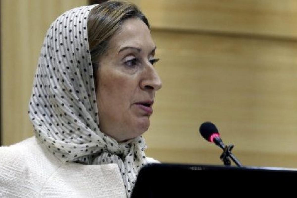 El velo se le escurre varias veces a la ministra de Fomento durante una rueda de prensa en Irán