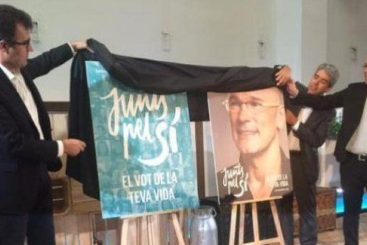 La candidatura ha preparado un cartel de campaña con el jefe de filas de la candidatura, Raül Romeva, pero también otro con los cincos primeros candidatos de la lista de Barcelona: el propio Romeva, Carme Forcadell; Muriel Casals; Artur Mas (CDC) y Oriol Junqueras (ERC).