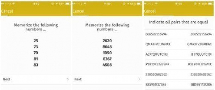 Lo siguiente es una serie de tests para medir la memoria en los que se muestra una combinación de números que tendremos que recordar. Después, una prueba de velocidad de procesamiento en la que hay que emparejar series de cifras y letras iguales. Una vez superada ésta, llega la dedicada a la memoria de trabajo en la que hay que ir sumando cifras. Y por último, la app nos preguntará si consideramos que hemos dormido o comido lo suficiente, y si hemos hecho la prueba en casa, en el trabajo o rodeados de gente.